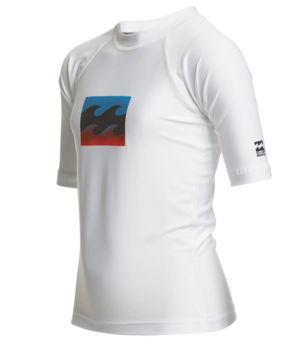 Catch waves in this Billabong Boys’ All Day Wave Performance Fit Short Sleeve Rashguard, delivering UPF 50+ sun protection with ergonomic seams and a silky smooth fit.