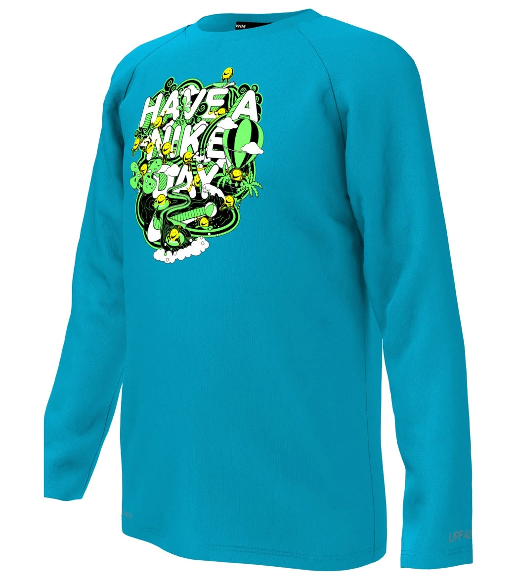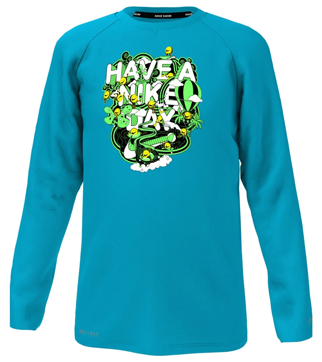 Whether he is blocking a spike or riding a bodyboard, he’ll be protected and comfortable in the Nike Boys’ Have a Nike Day Hydro Long Sleeve Rashguard (Little Kid). He’ll stay happy and dry with the Dri-FIT® technology while the UPF technology will protect him from damaging UV rays.