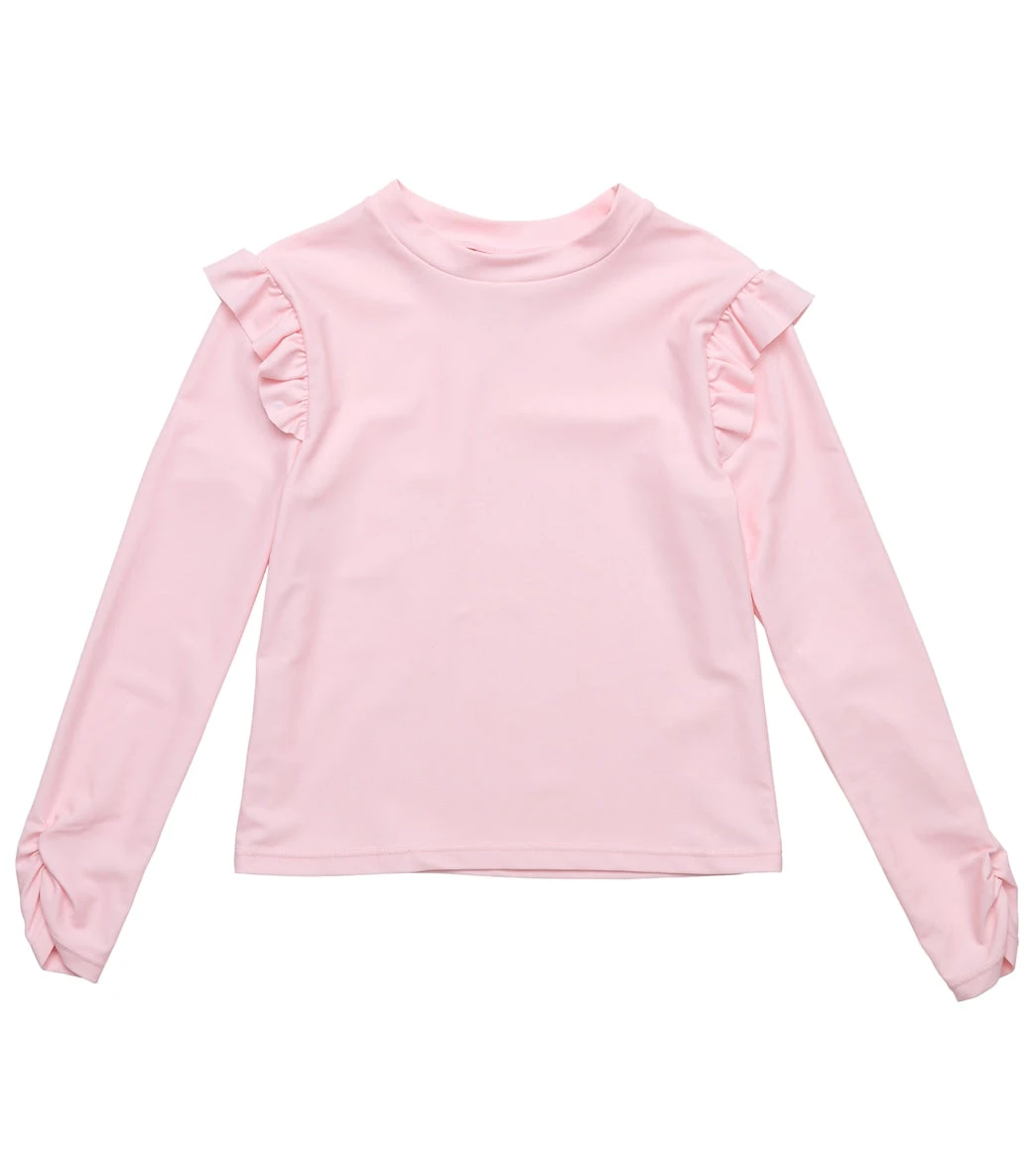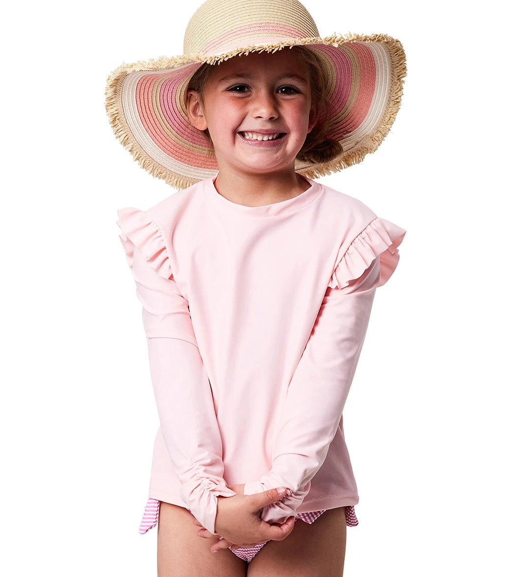 Pretty in pink and perfect for all swimming adventures, the Snapper Rock Girls’ Ballet Pink Long Sleeve Rash Guard (Toddler, Little Kid, Big Kid) features rouching at the sleeve hems and sweet shoulder frills on the sizes 2 – 6 years.